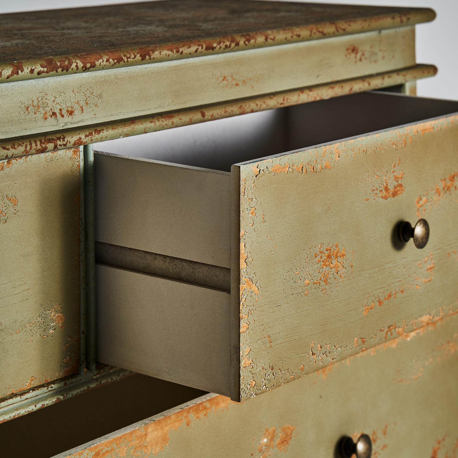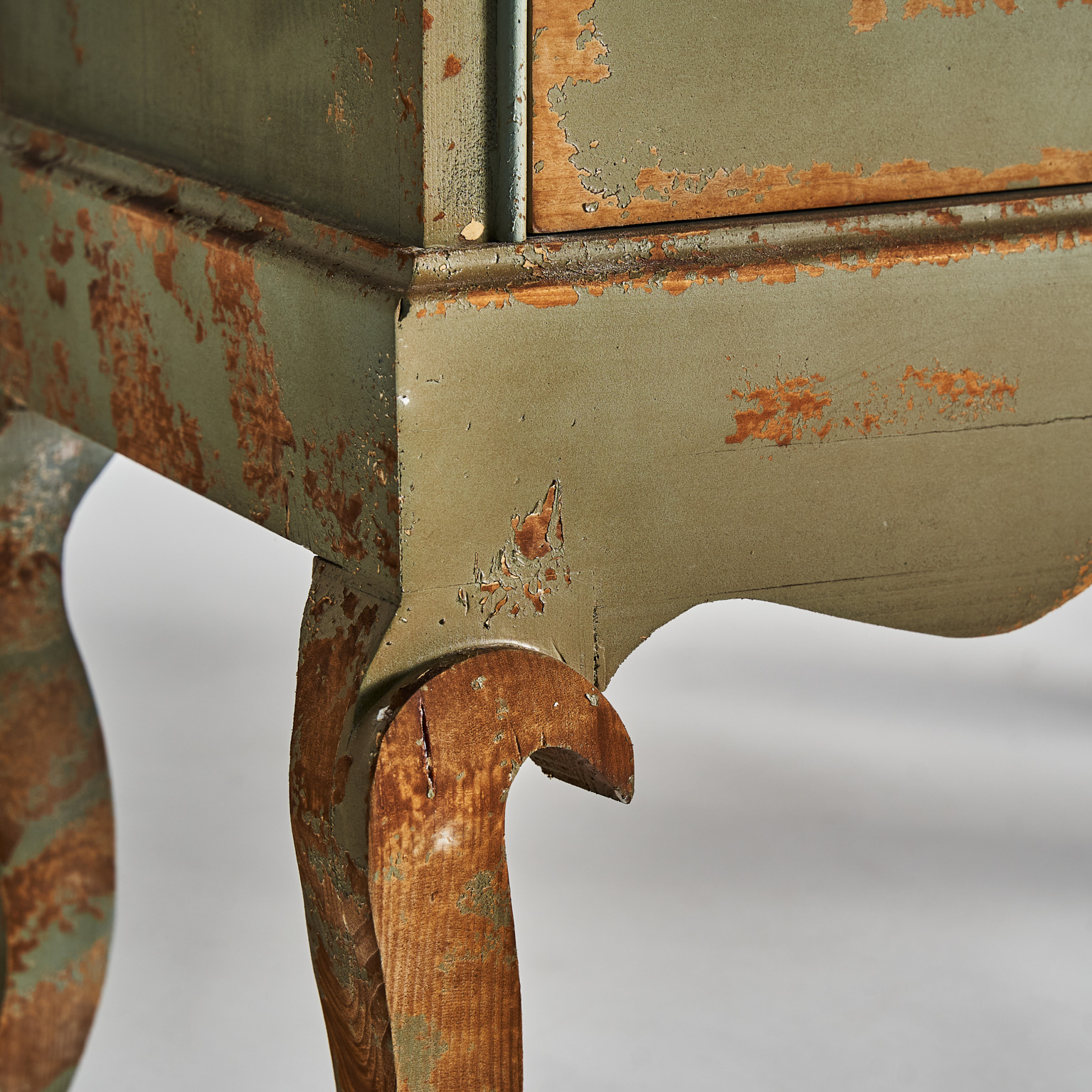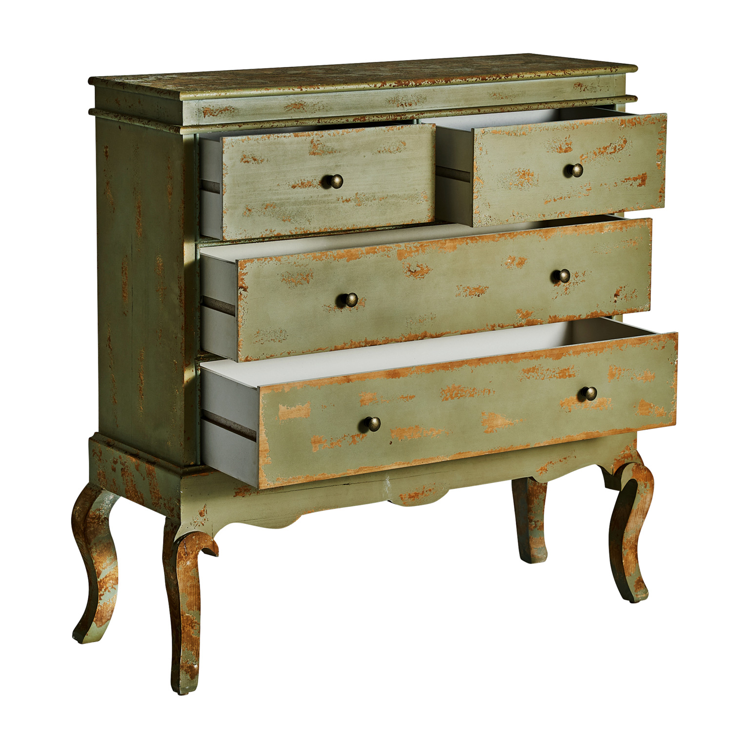 Cómoda formelle en color tonos en verde envejecido de estilo colonial. Fabricado en madera de abeto.